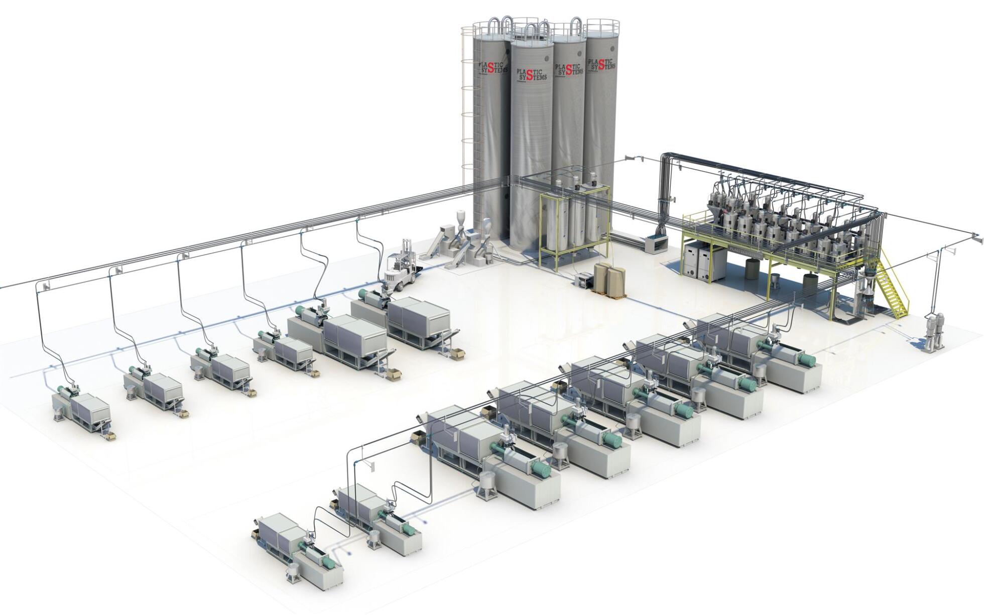 采用微機(jī)集中自動(dòng)控制,根據(jù)機(jī)臺(tái)分布和用料情況,結(jié)合輔機(jī)設(shè)備,實(shí)現(xiàn)數(shù)據(jù)化集中供料、控制,全場(chǎng)無人化不間斷生產(chǎn)的系統(tǒng)解決方案